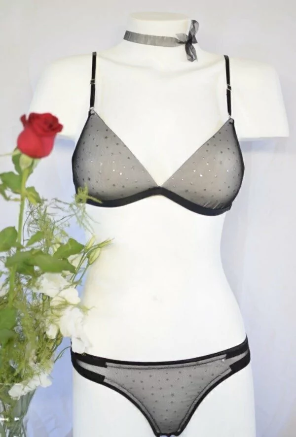 Este conjunto combina dos texturas que se complementan a la perfección: el microtul liviano que aporta transparencia y el toque justo de sensualidad, y la base de microfibra con foil o brillo suave que le da cuerpo y luminosidad.